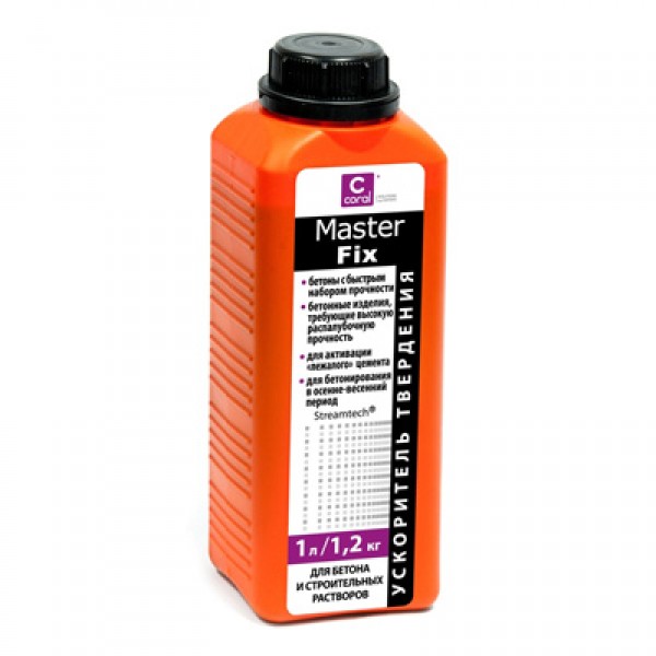 С использованием ускорителя твердения Coral MasterFix расход цемента уменьшается на 15-20%, а также повышается оборотность формовочной оснастки. Высокое качество, умеренная стоимость и простота применения делают этот материал важной составляющей при выполнении строительных и ремонтных работ. Ускоритель не только влияет на время рабочего процесса, но и сохраняет неизменными высокую легкопрокладываемость и технические свойства раствора.