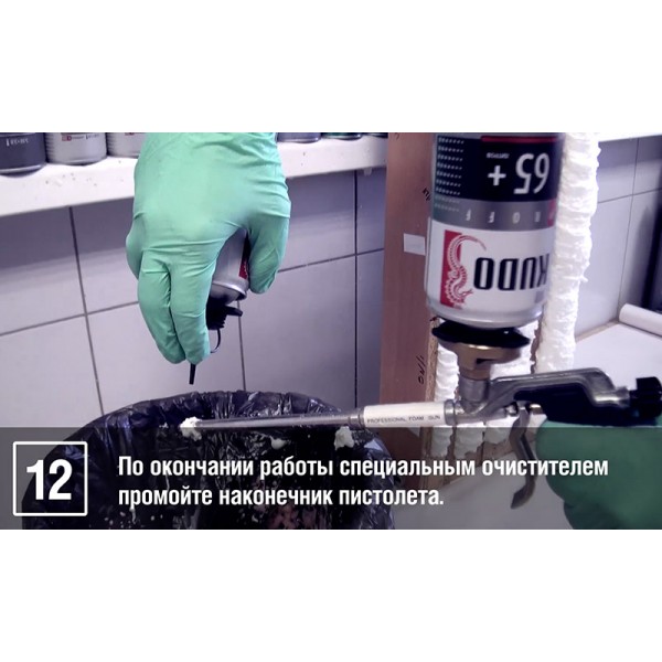 - Для смывания загрязнений монтажной пеной с кожи и одежды необходимо использовать распылитель (в комплекте), предварительно закрепив его на выпускном клапане.